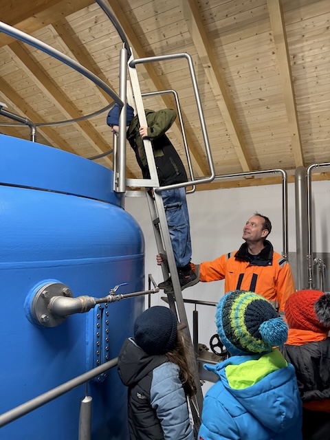 Bevor das gewonnene Wasser aber als Trinkwasser genutzt werden kann, durchläuft es mehrere Aufbereitungsstationen. Die aufwendige Wasseraufbereitung erfolgt unter anderem mit Hilfe von Aktivkohle in zwei riesigen, blauen Wassertanks. Jeder dieser Tanks fasst 28 000 Liter Wasser. Die Besichtigung der Aufbereitungsanlage war für die Kinder besonders aufregend. In Kleingruppen durften wir über eine Leiter bis ganz nach oben klettern und durch ein kleines Fenster von oben in den Tank schauen. Das war sehr beeindruckend! Die aufwendige Aufbereitung des Wassers ist notwendig, damit unser Trinkwasser stets die vorgeschriebenen Werte des Gesundheitsamtes erfüllt. Regelmäßig wird dies durch Wasserproben im Labor überprüft.